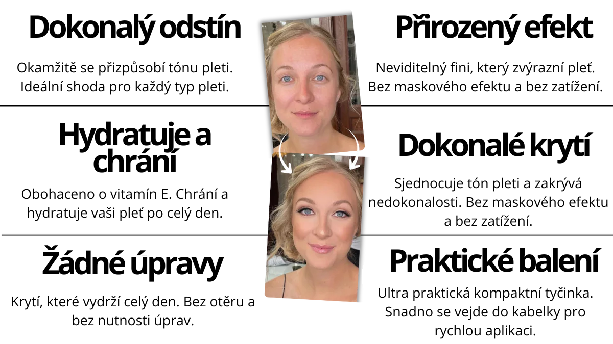 Náš tyčinkový make-up 2 v 1 kombinuje make-up a péči o pleť v jednom jednoduchém kroku. Díky složení s výživnými složkami intenzivně hydratuje pleť a zároveň ji sjednocuje. Obohacený o vitamín E a ochranné minerály poskytuje krytí, které zanechává vaši pleť jemnou, zářivou a chráněnou po celý den. Jeho složení se přizpůsobí tónu vaší pleti a je vhodné pro všechny typy pleti.